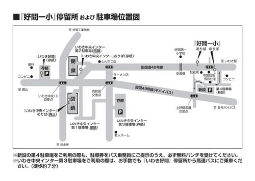いつも会津バスをご利用下さいましてありがとうございます。 標記につきまして、常磐自動車道4車線化工事に伴い、『いわき中央インター』停留所(のりば)および第1・第2駐車場が7月1日(土)より長期間にわたり閉鎖となります。関連して停留所および駐…