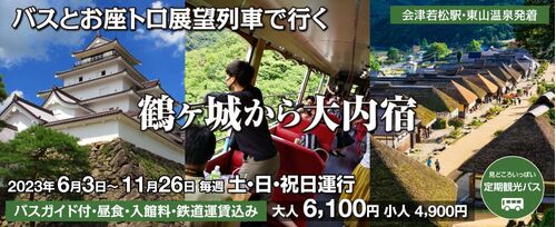 定期観光バス 鶴ヶ城から大内宿の予約が始まりました! 今年度はお座トロ展望列車に乗車して大内宿へ向かいます! 期間:2023年6月3日(土)~11月26日(日)毎週土・日・祝日運行 リニューアルされたばかりの天守閣鶴ヶ城! 老舗割烹 田季野の特別昼膳「…