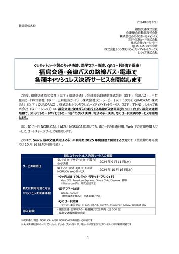 平素より、会津バスをご利用いただき誠にありがとうございます。 この度、路線バスでクレジットカードやデビットカード等のタッチ決済、電子マネー決済、QRコード決済のサービスを開始いたします。また、ICカード「AIZU NORUCA」においても、福島交通株式会…