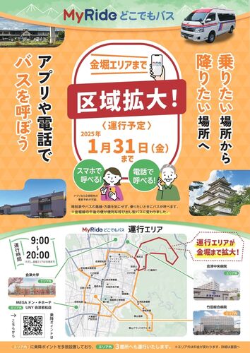 平素より、会津バスをご利用いただきまして誠にありがとうございます。 2024年10月1日より、金堀線の減便に伴い、代替交通としてMyRideどこでもバスの運行区域を金堀地区へ拡大します。 金堀線の午後の便が便利な「呼び出し型バス」に変わりました。 ◎金堀線…