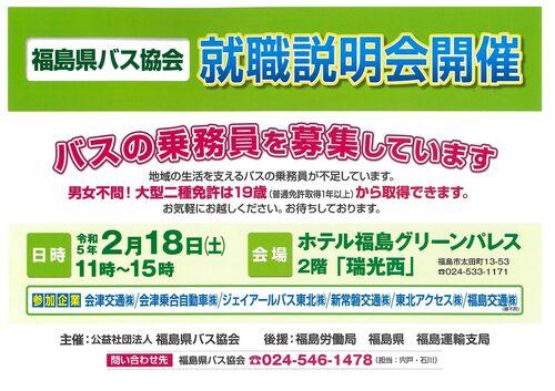 福島県バス協会主催による「就職説明会」を開催いたします! ◎バスの乗務員募集! ◎男女不問! ◎大型二種免許は19歳(普通免許取得1年以上)から取得できます。 日時:2023年2月18日(土) 11時~15時 会場:ホテル福島グリーンパレス2階「瑞光西」 福島…