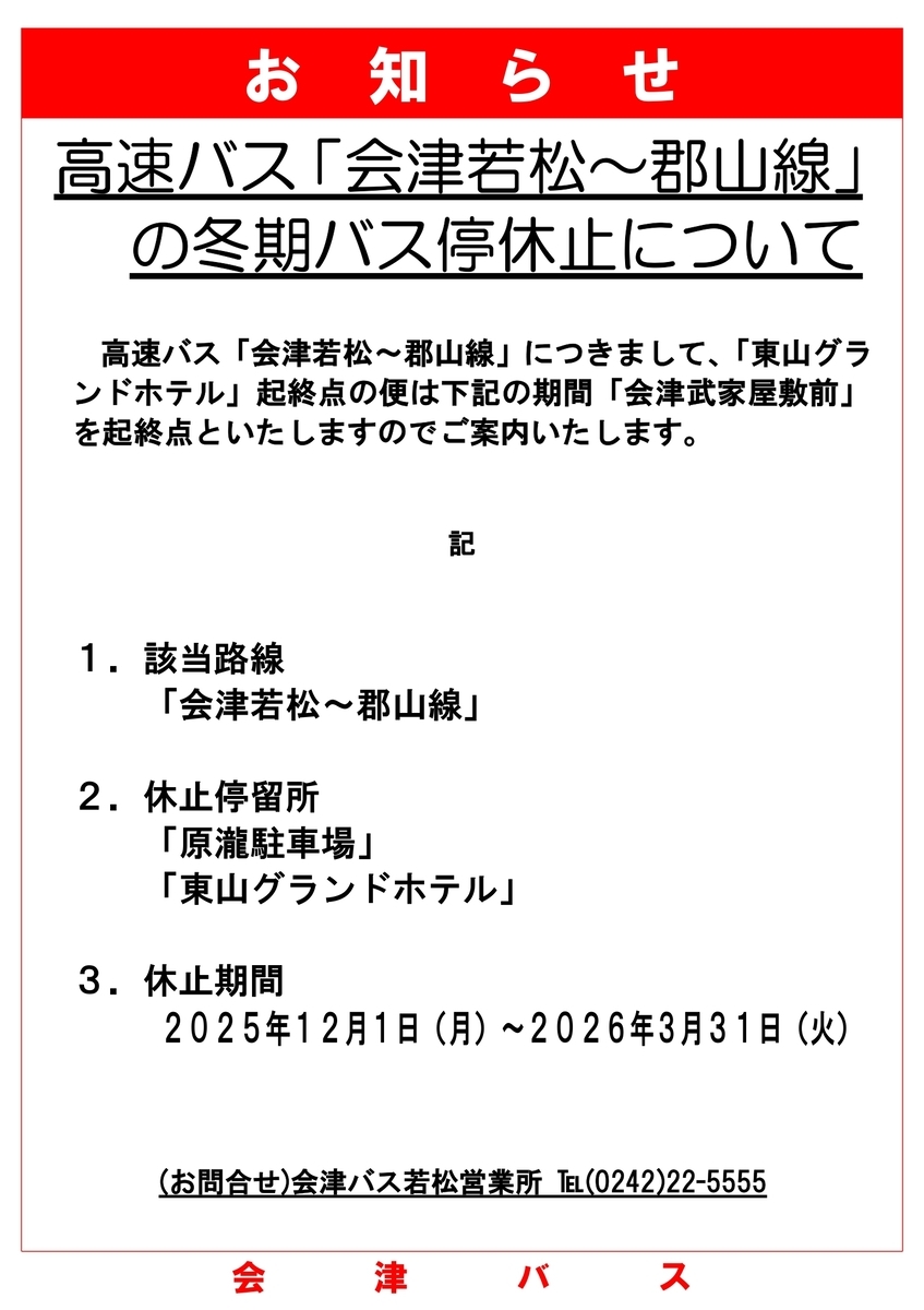 お問い合わせ:会津バス若松営業所 TEL 0242-22-5555